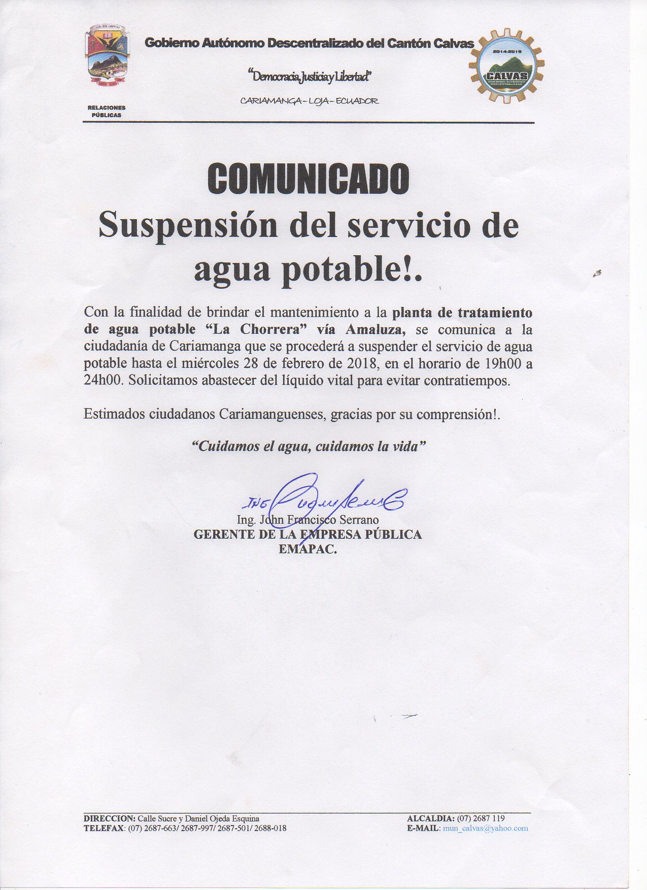 Suspensión del servicio de agua potable desde el día Lunes 26 de febrero del 2018 desde las 19:00 (7 de la noche), hasta el día miércoles 28 de febrero del 2018