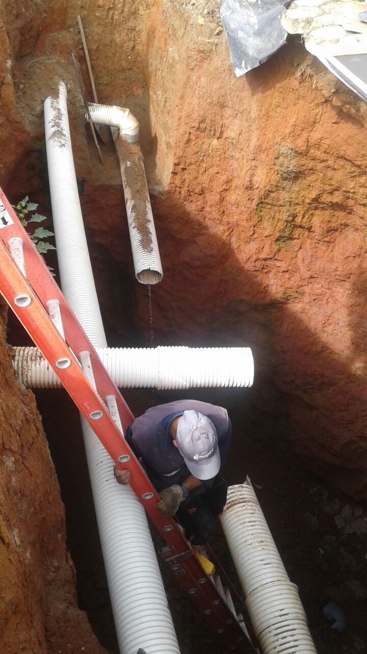 La Empresa Pública Municipal de Agua Potable y Alcantarillado del Cantón Calvas, realiza trabajos de reparación de tuberia de alcantarillado sanitario, en el socavón producido por el hundimiento de la vía en la construcción del tunel en las calles Bolivia entre Atahualpa y Centenario